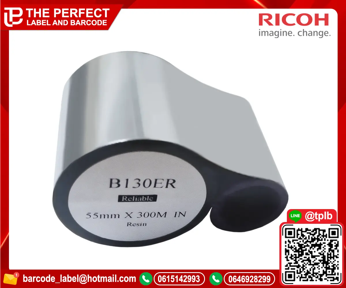 Ribbon Resin Size 55mm x 300m RICOH B130ER สำหรับการพิมพ์แบบ Thermal Transfer Overprinter (TTO) หรือการพิมพ์วันที่ผลิต วันหมดอายุ บาร์โค้ด และข้อมูลแบบ Real-time ลงบนบรรจุภัณฑ์
