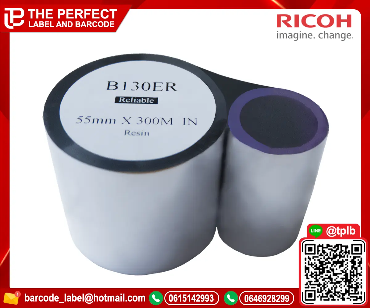 Ribbon Resin Size 55mm x 300m RICOH B130ER For TTO เป็นริบบอนแบบ Resin สำหรับการพิมแบบ TTO โดยเฉพาะ สามารถทนการขีดข่วน การเสียดสี และทนแอลกอฮอล์ ได้อย่างยอดเยี่ยม